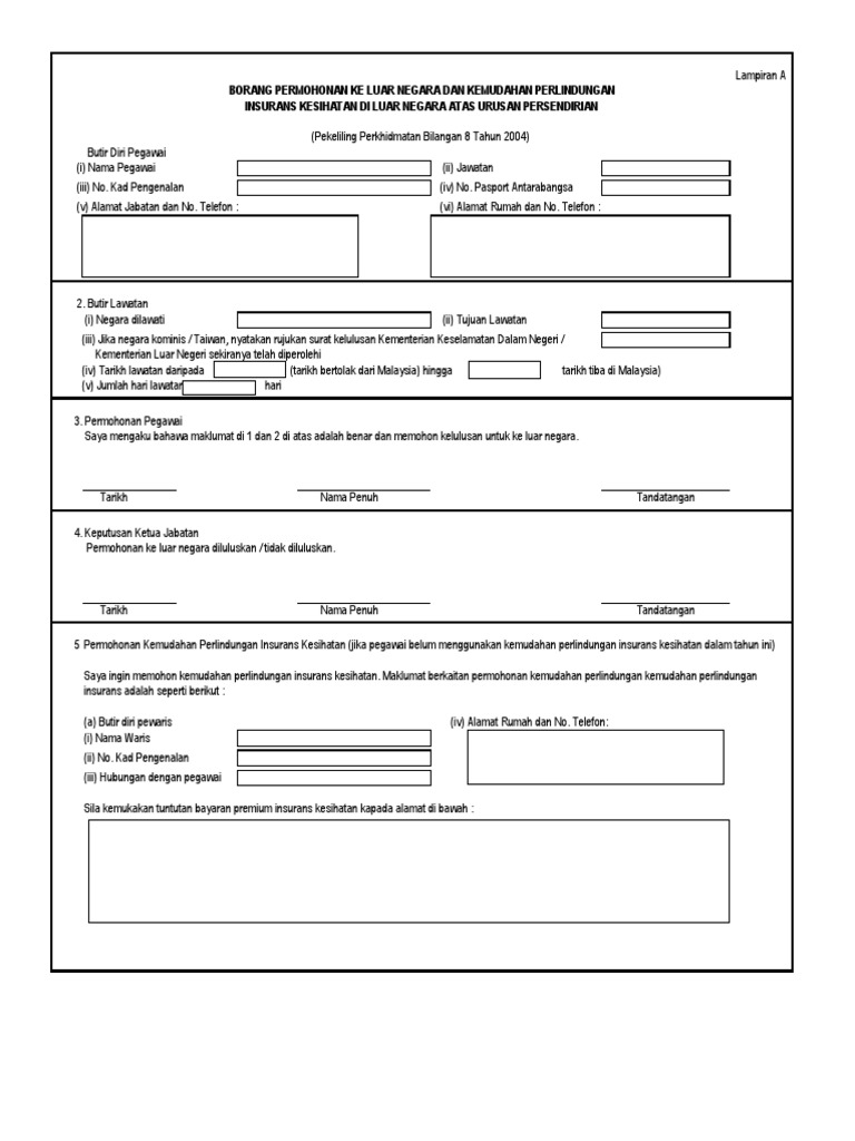 Related : Pekeliling Lawatan Keluar Negara - Lampiran a borang permohonan ke luar negara dan kemudahan perlindungan insurans kesihatan di luar negara atas urusan persendirian (hendaklah diisi dalam 4 salinan) (pekeliling..