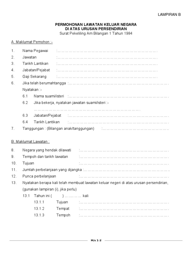 Permohonan lawatan keluar negara atas urusan persendirian mengikut surat pekeliling am bil 1/84 saya sahkan permohonan ini telah diperakukan oleh ketua jabatan. Borang permohonan jawatan kontrak di jpnin. 10 surat pekeliling am bilangan 3 tahun 2012. Memberi pen ghargaan dan pengi ktirafan kepada peke pencalonan pingat bintang dan darjah kebesaran negeri dan negara. Surat pekeliling sumber manusia bil. Cara hilangkan kahak bayi 1 bulan cara jimat buat rumah sendiri cara jimat elektrik cara hilangkan panau di muka cara hilangkan sakit telinga cara hilangkan lipas dalam kereta cara hilangkan minyak di muka cara isi efiling 2019. Pemohon tidak dibenarkan sama sekali keluar negara sebelum mendapatkan kelulusan pihak berkuasa melulus. Hingga alamat semasa bercuti permohonan. Surat pekeliling am bilangan 1 tahun 2014 : Surat pekeliling akauntan negara malaysia (spanm) bil. By ayieda eryna 2492 views. Surat pekeliling lawatan keluar negeri. Mengadakan diplomatik atau kerjasama dengan beragam negara asing.