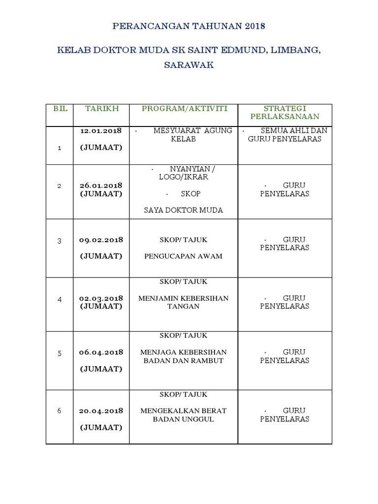 Kelab Doktor Muda from sites.google.com Pelancaran kelab doktor muda sk taman daya 3 telah diadakan pada 23/07/2012 yang lalu. Download rancangan tahunan kelab badminton 2015 download document. Mei 1998 p.u.(a) 196 , yang berkait dengan seksyen 130, akta pendidikan 1996 dengan ini memohon untuk menubuhkan kelab doktor muda mulai 7 hb februari 2017. Sumber pendidikan > kokurikulum > kokurikulum > koleksi rancangan aktiviti tahunan persatuan dan kelab. 0 ratings0% found this document useful (0 votes). Perancangan aktiviti tahunan doktor muda sjk(t) west country (timur) tarikh tempat aktiviti catatan 7/2/2018 bilik wawasan sjk(t)td mesyuarat perancangan aktiviti tahunan 21/2/2018 pusat sumber perjumpaan ahli unit beruniform dan pendaftaran ahli baru sesi. Tuan, permohonan menubuhkan kelab doktor muda saya dengan segala hormat merujuk perkara di atas. Rancangan tahunan kelab wushu minggu tajuk isi kandungan aktiviti 1 pendaftaran ahli pendaftaran ahli 1.â â â pendaftaran ahli 2.â â â penubuhan pasukan kawad…