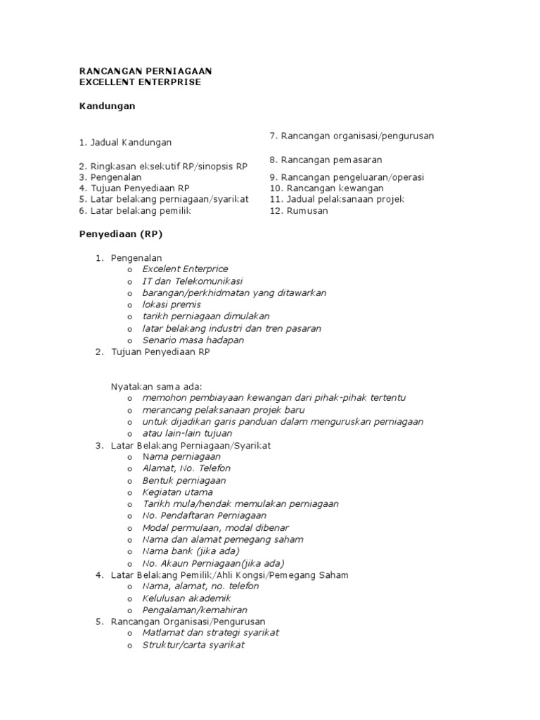 Rancangan Perniagaan Doc Document from demo.vdocuments.mx Pengertian ergonomi menurut wignjosoebroto s adalah ilmu yang sistematis untuk memanfaatkan informasi mengenai kemampuan dan keterbatasan manusia dalam merancang suatu. Tentang produk atau jenis perkhidmatan dan servis yang akan dijalankan. No.7, taman indah, , 35900 tanjung malim, perak. Perniagaan terutamanya bagi tujuan pembiayaan dan pemasaran produk. Berikut ialah senarai untuk memulakan anda. Ayat atau perenggan pendek yang menerangkan tujuan perniagaan anda dan manfaatnya. Tujuan rancangan perniagaan ini disediakan adalah khusus untuk memohon. Read this essay on rancangan perniagaan.